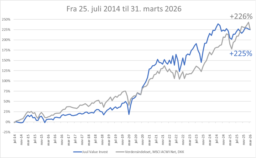 Siden Juul Value Invests opstart i juli 2014 er det samlede afkast til aktionærerne på 225 procent mod 226 procent for det globale aktiemarked.